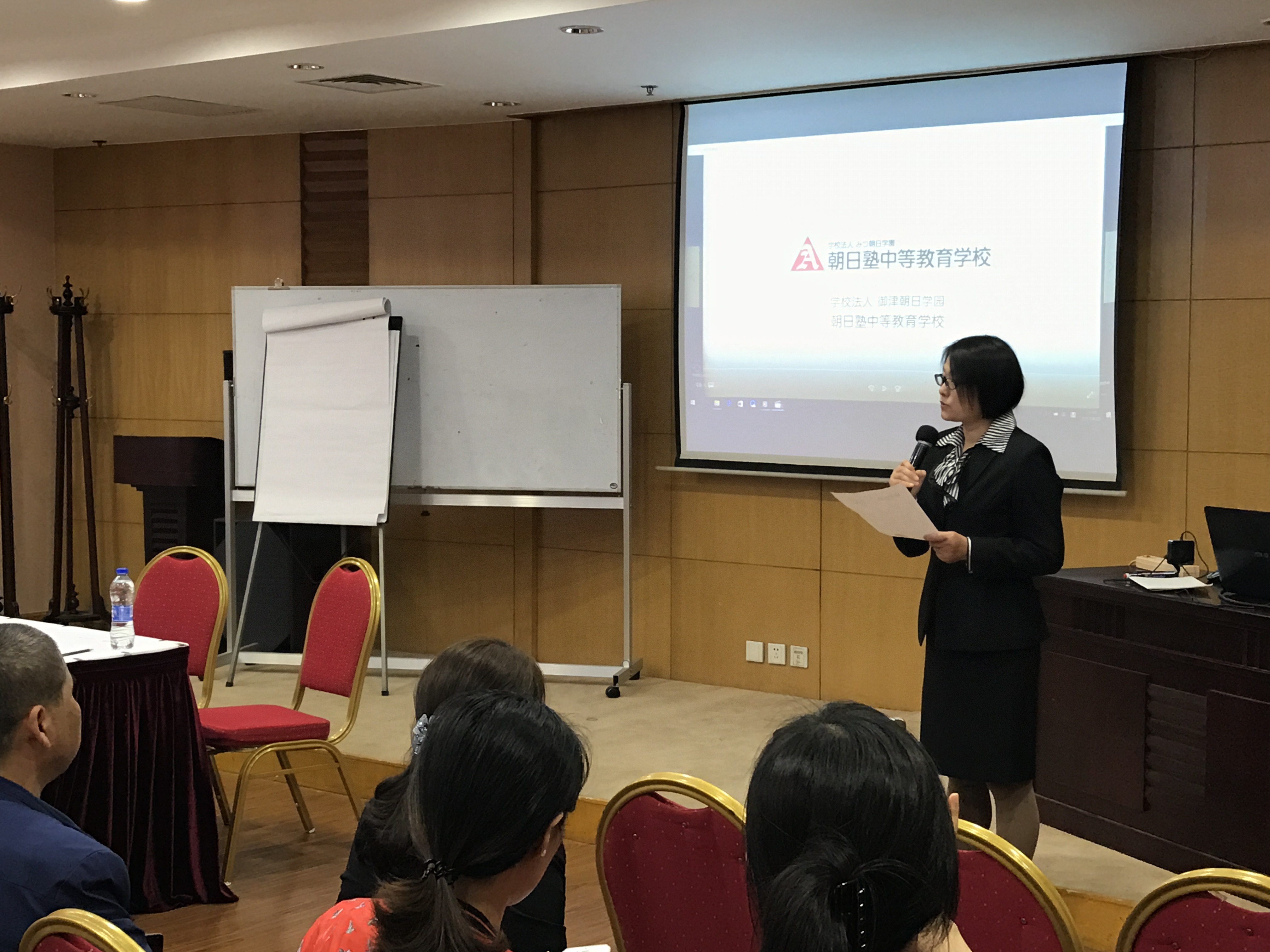 這場(chǎng)活動(dòng)的隨行翻譯由日本滋慶駐中國上海事務(wù)所的李老師負(fù)責(zé)擔(dān)任,學(xué)園理事長石川先生致辭首先感謝學(xué)生和家長前來參加兩所學(xué)校的說明會(huì)&考試,之后由負(fù)責(zé)兩個(gè)高中的久原老師和高野老師為大家詳細(xì)介紹學(xué)校。