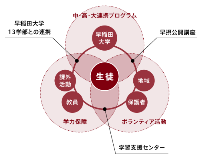 早稻田攝陵高等學(xué)校于昭和37年(1962年)建校,是早稻田大學(xué)的附屬高中。把校訓(xùn)是“自律,責任,務(wù)實”作為教育的主干,努力培養(yǎng)貢“獻地域社會,國際社會的人才”。