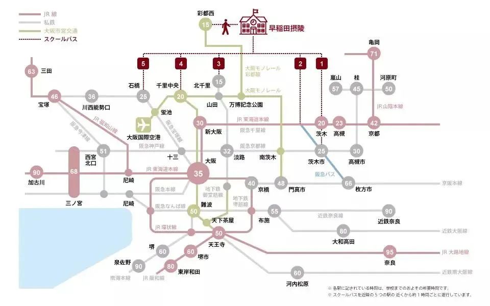 乘車時間大約20分鐘。另外,阪急巴士也可以來學(xué)校。