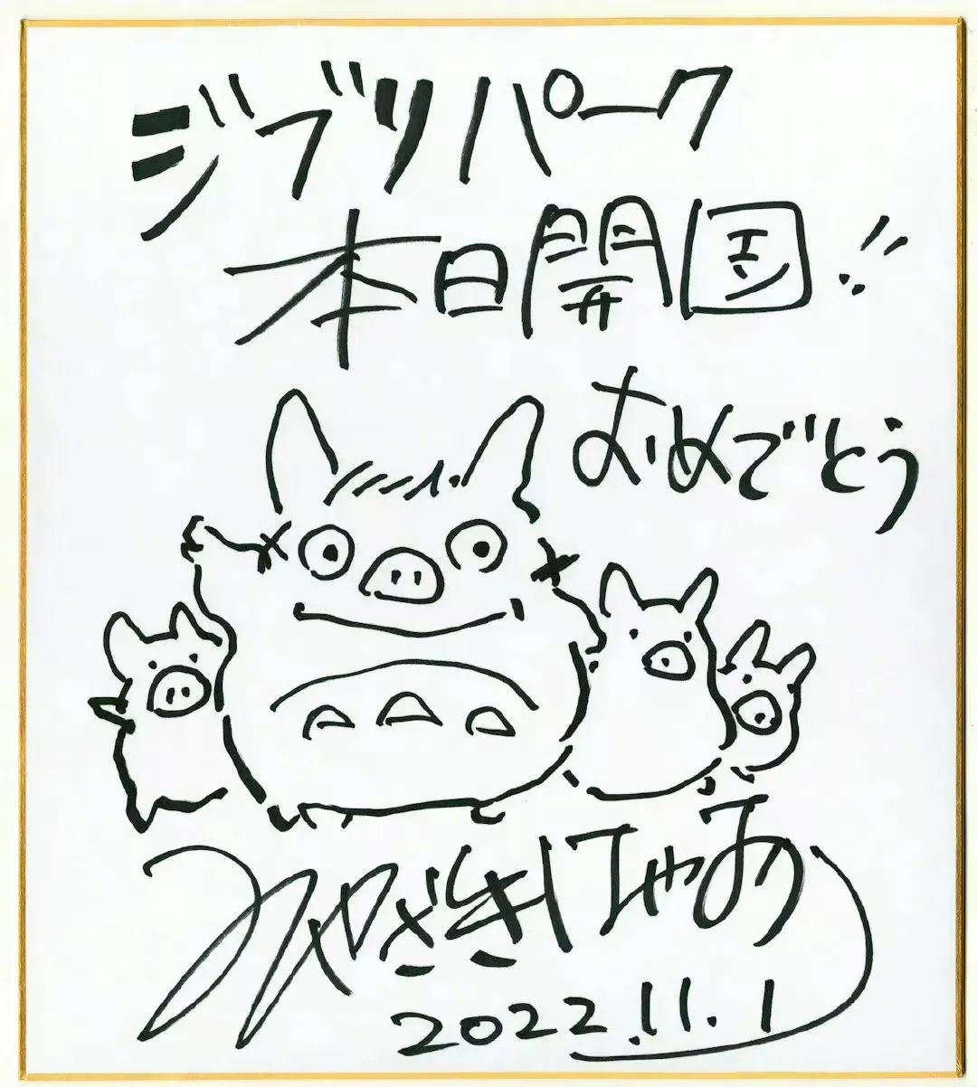 11月1日,是全球首家吉卜力主題公園面世迎客的日子。對于眾多吉卜力動畫和宮崎駿的粉絲來說,當天莫過于一個重要的節(jié)日慶典,大師本人也為此特意手繪了一幅豬鼻子龍貓圖作為慶賀。