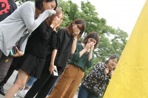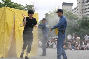 還有用滅火器--消火器(しょうかき)進行的滅火練習(xí),大家都知道向下讓水出來是關(guān)鍵,可是還是有點困難啊。。。