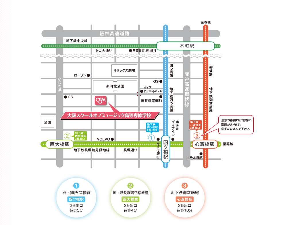 大阪府大阪市西區(qū)心齋橋商業(yè)區(qū) 學(xué)校附近有三條地鐵線,交通非常便利